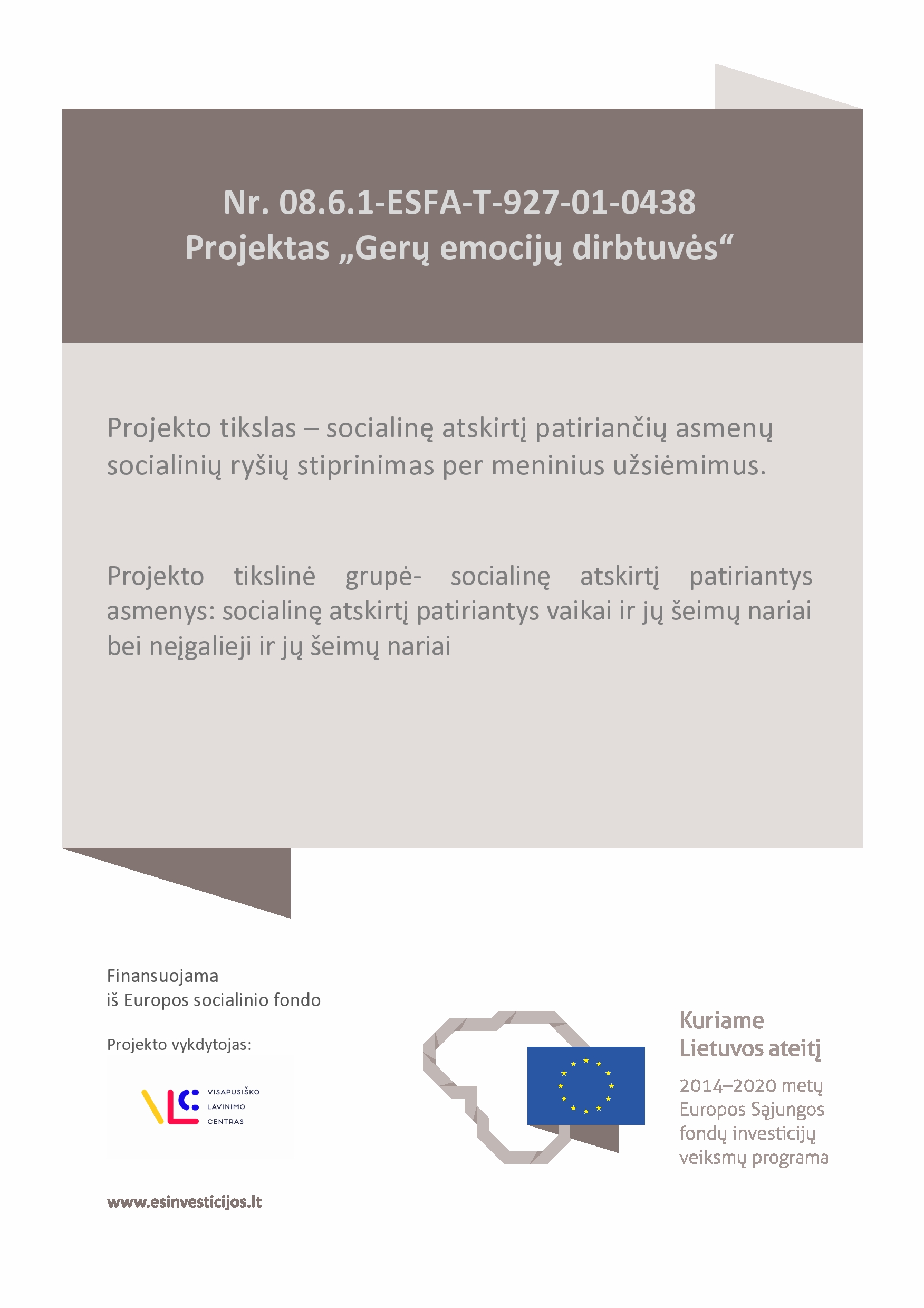 VšĮ Vaikų ir jaunimo visapusiško lavinimo centras kartu su projekto partneriais sutrikusio intelekto žmonių globos bendrija "Jonavos Viltis" ir Jonavos Justino Vareikio progimnazija nuo 2020 m. lapkričio 3d. įgyvendina 2014-2020 m. ESFIVP priemonės Nr.08.6.1-ESFA-T-927 "Spartesnis vietos plėtros strategijų įgyvendinimas" projektą - "Gerų emocijų dirbtuvės".